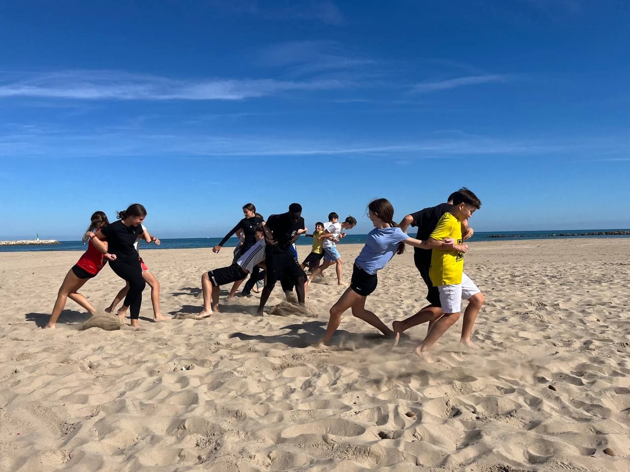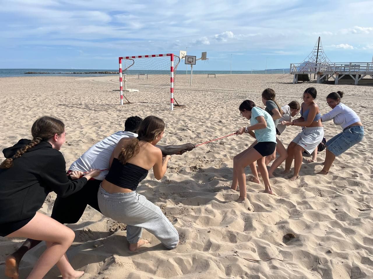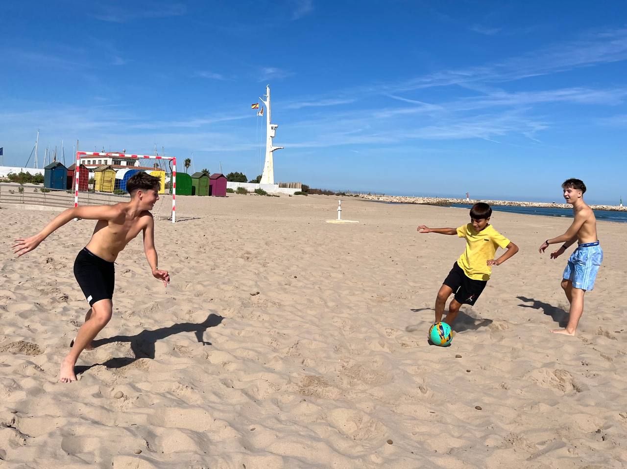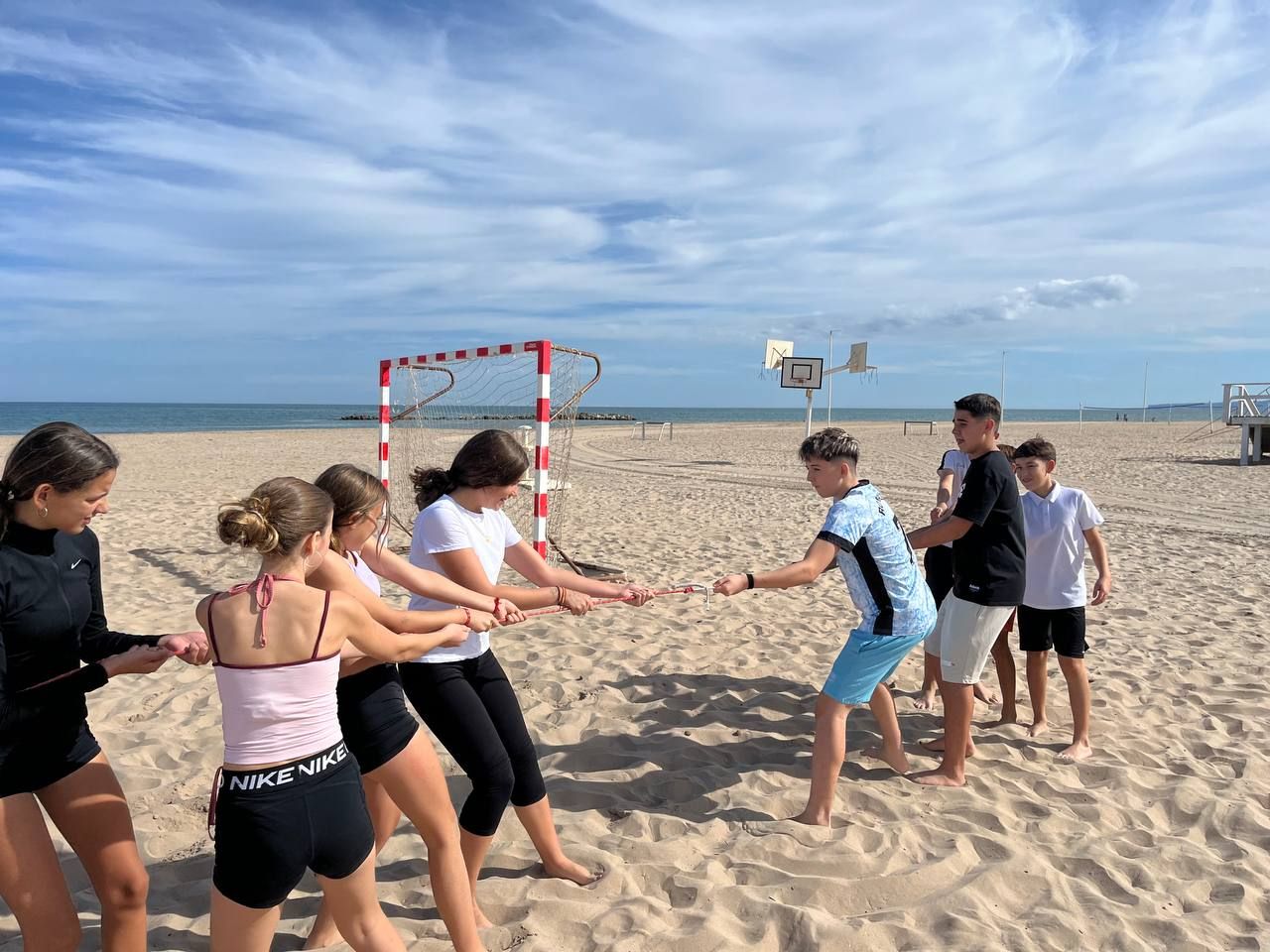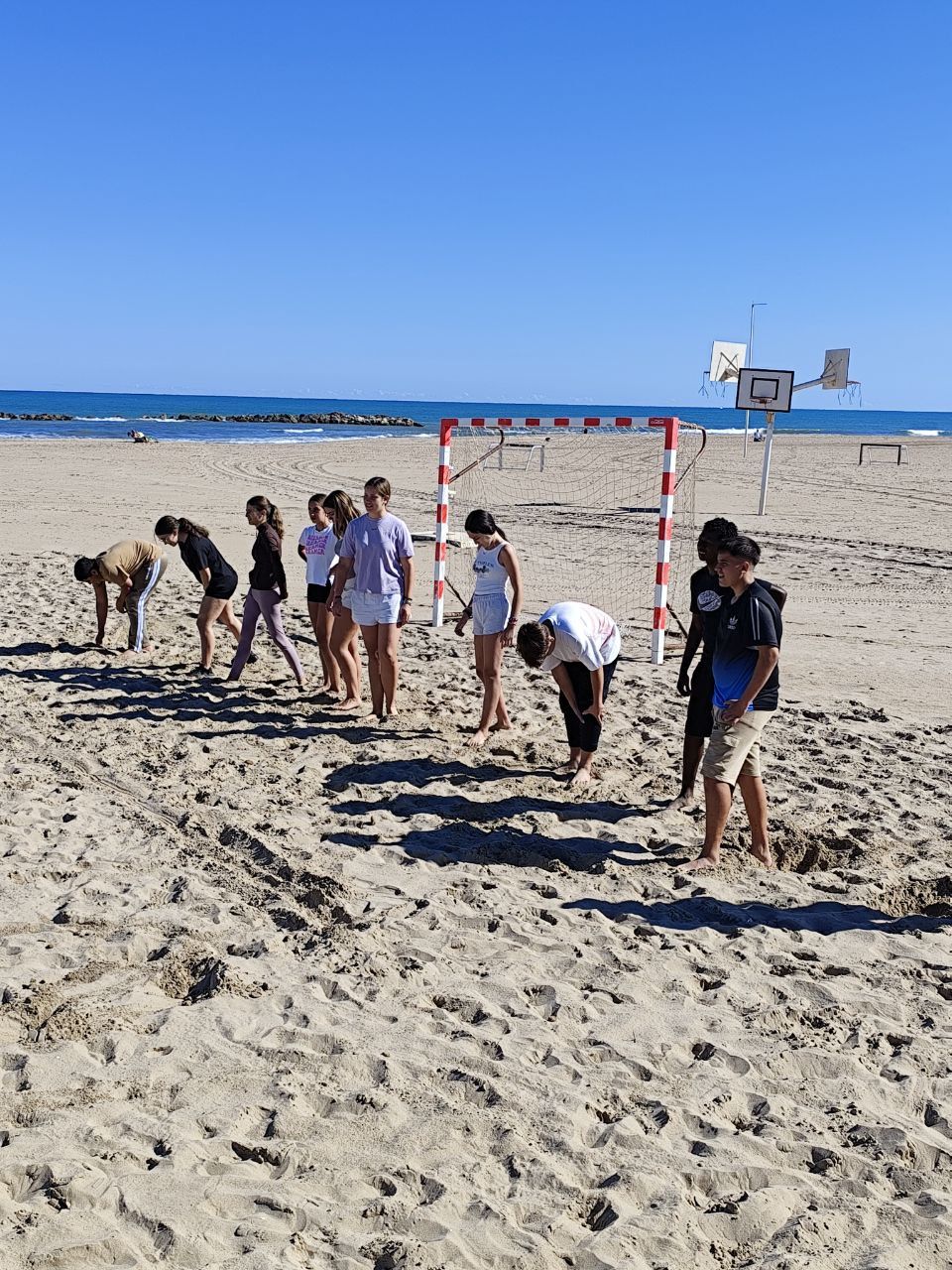 Se dividieron en dos grupos: mientras uno practicaba el tiro con arco, el otro disfrutaba de juegos y deportes en la playa, aprovechando un momento de ejercicio y diversión al aire libre.