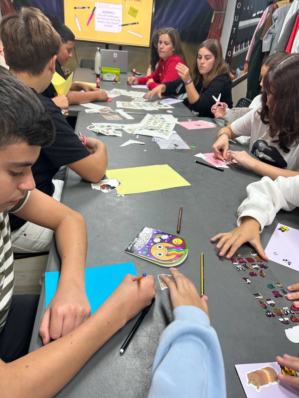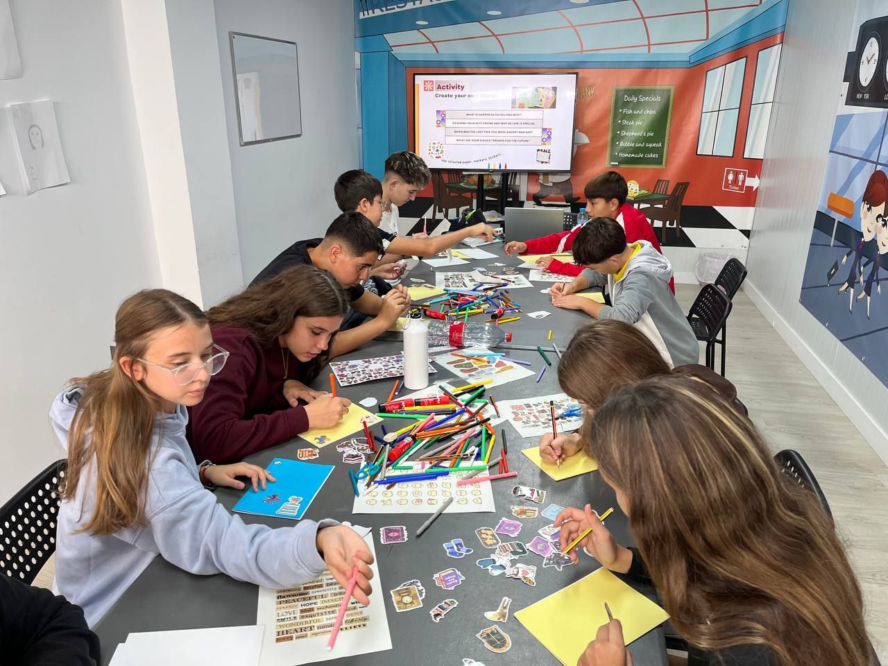 Tras la comida, los estudiantes realizan la actividad, "What would you do...", en la cual, los alumnos comparten sus reacciones ante diferentes situaciones hipotéticas. Luego, los alumnos, usando su imaginación, crearán nuevas situaciones y las comparten con todos sus compañeros. Posteriormente, los alumnos crean un tablero de emociones o "Mood Board", utilizando las situaciones hipotéticas creadas por los alumnos durante la actividad anterior.