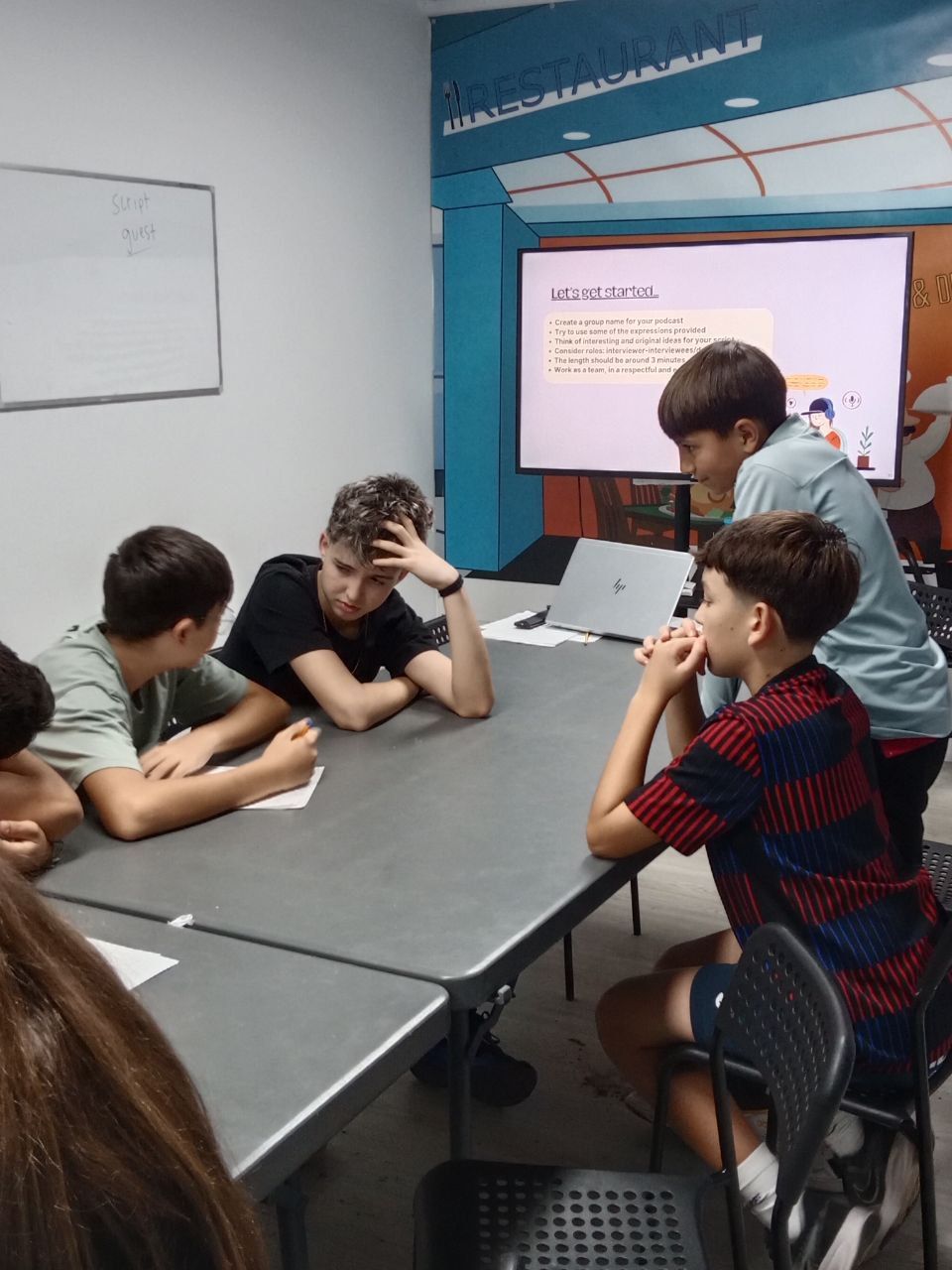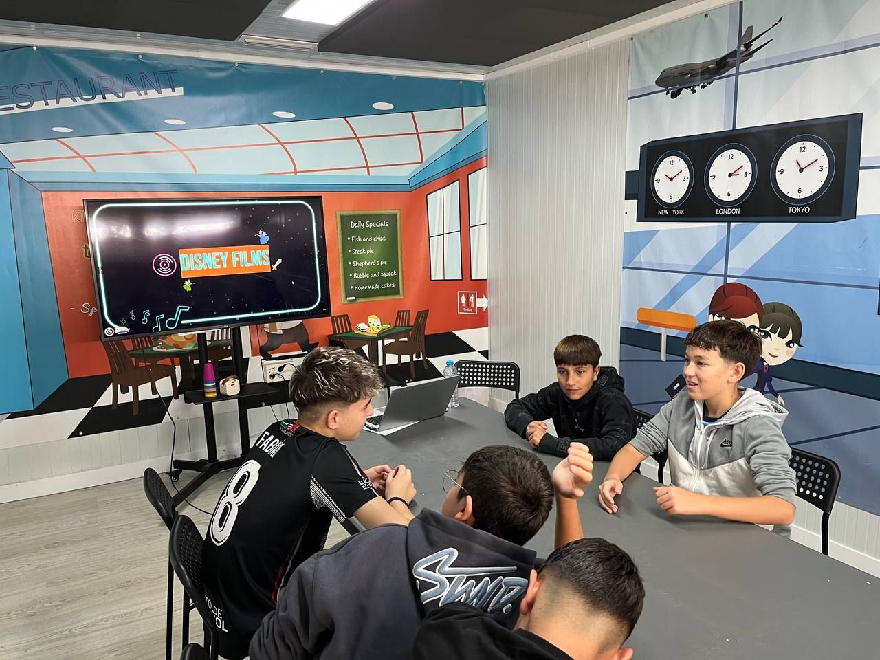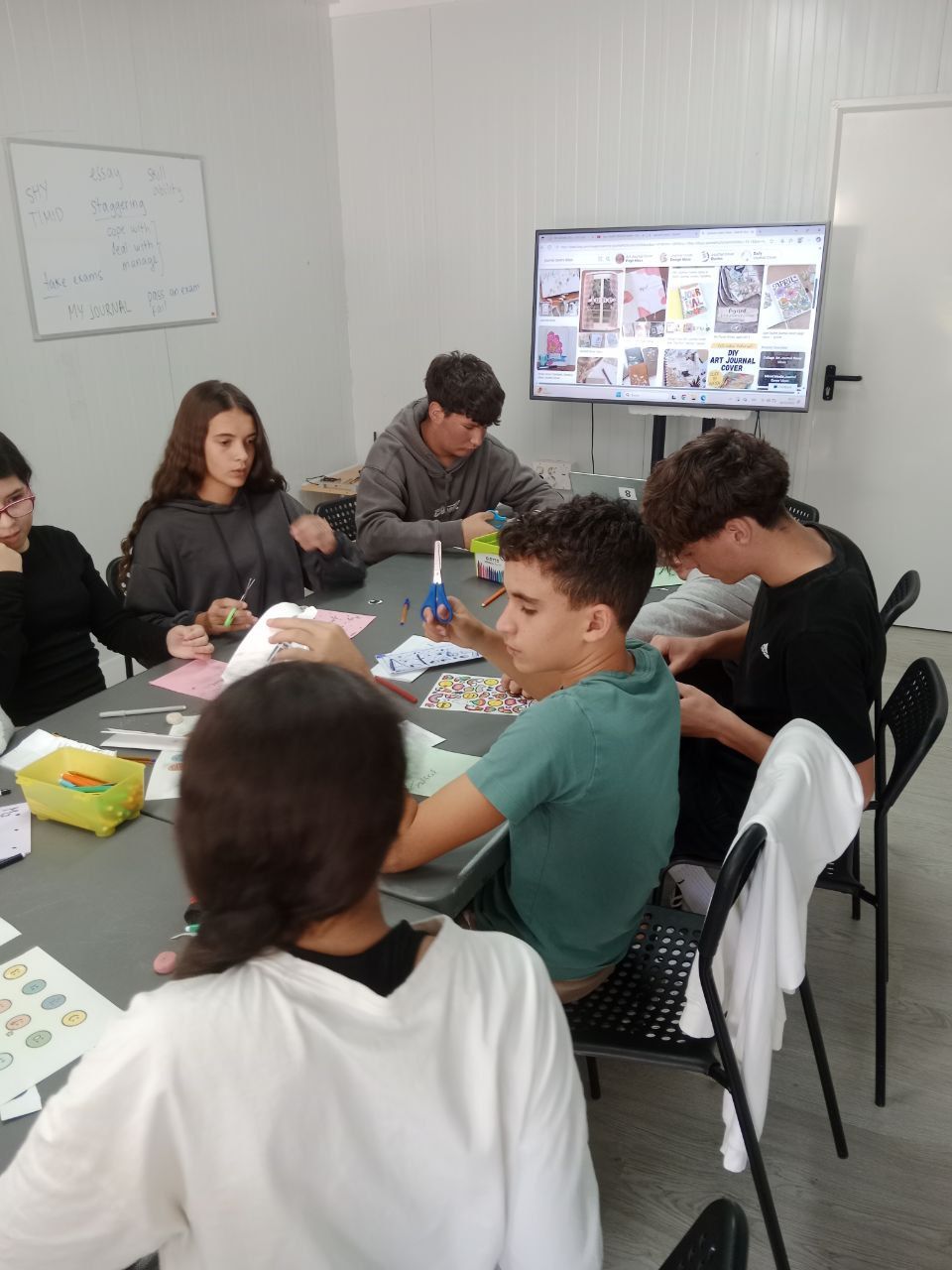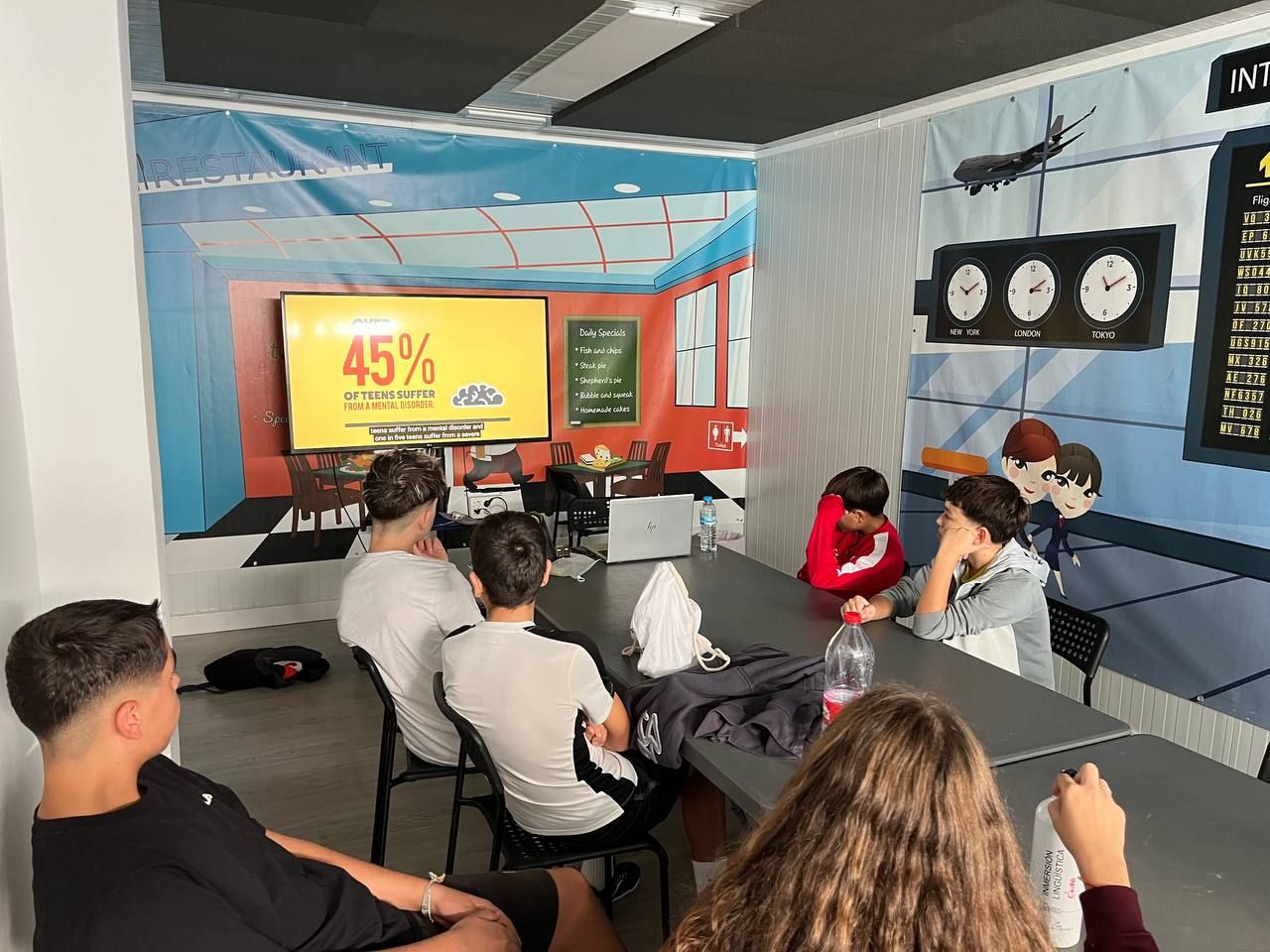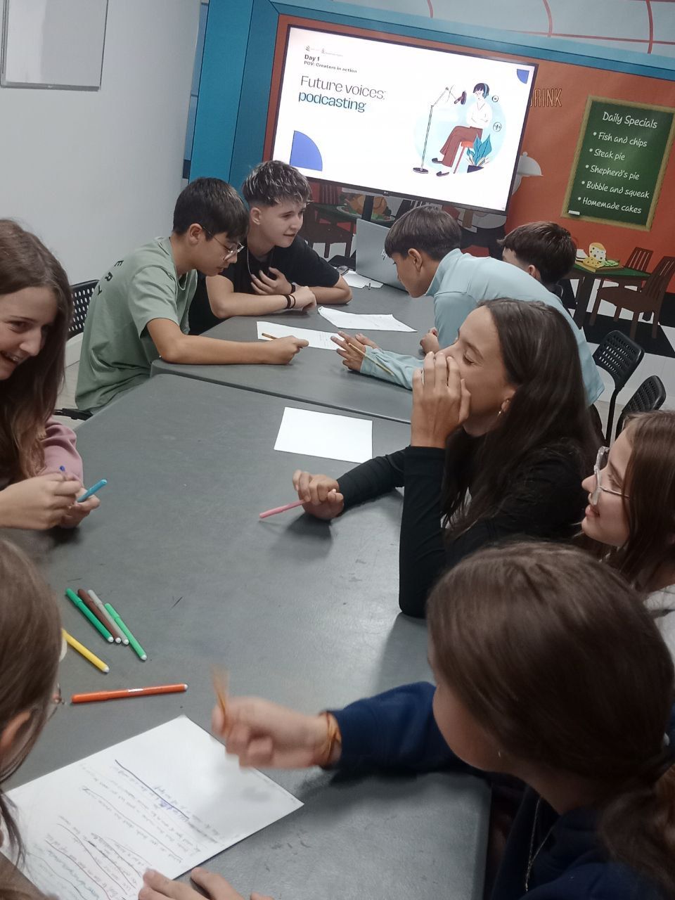 Durante la tarde, los estudiantes realizan la actividad "Future Voices". En grupos, los alumnos debaten sobre temas que les preocupan de cara al futuro y graban un podcast que compartirán luego con los otros grupos. Ha sido muy interesante y enriquecedor.
