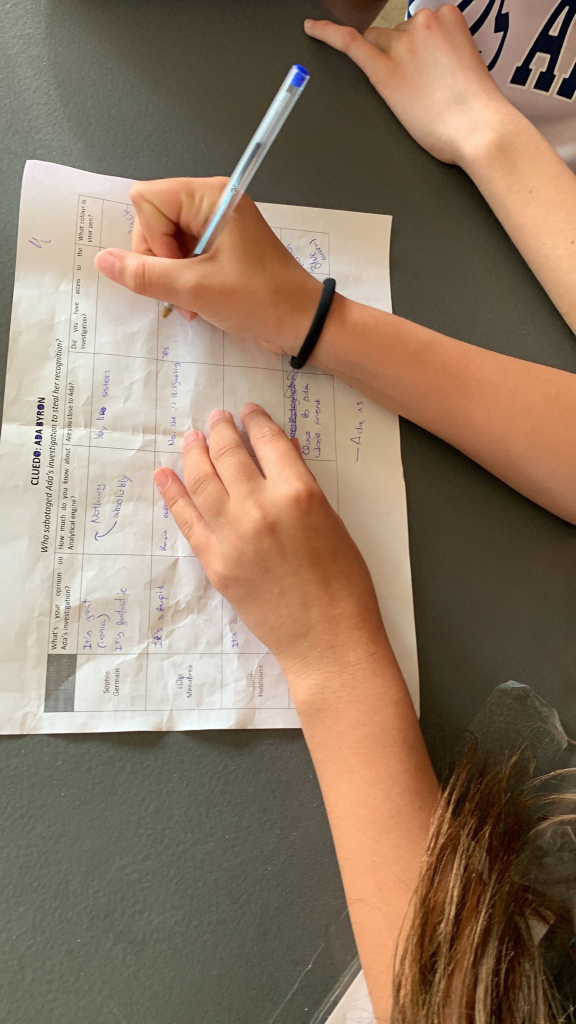 En las dos últimas horas de la tarde los alumnos participaron en un Cluedo en vivo sobre la historia de la científica que fue víctima de un plagio. Los profesores se convierten en personajes cercanos a Ada Byron y los alumnos en sus grupos deben realizarles preguntas para así resolver el misterio de quién fue el responsable de robarle el mérito de su trabajo.