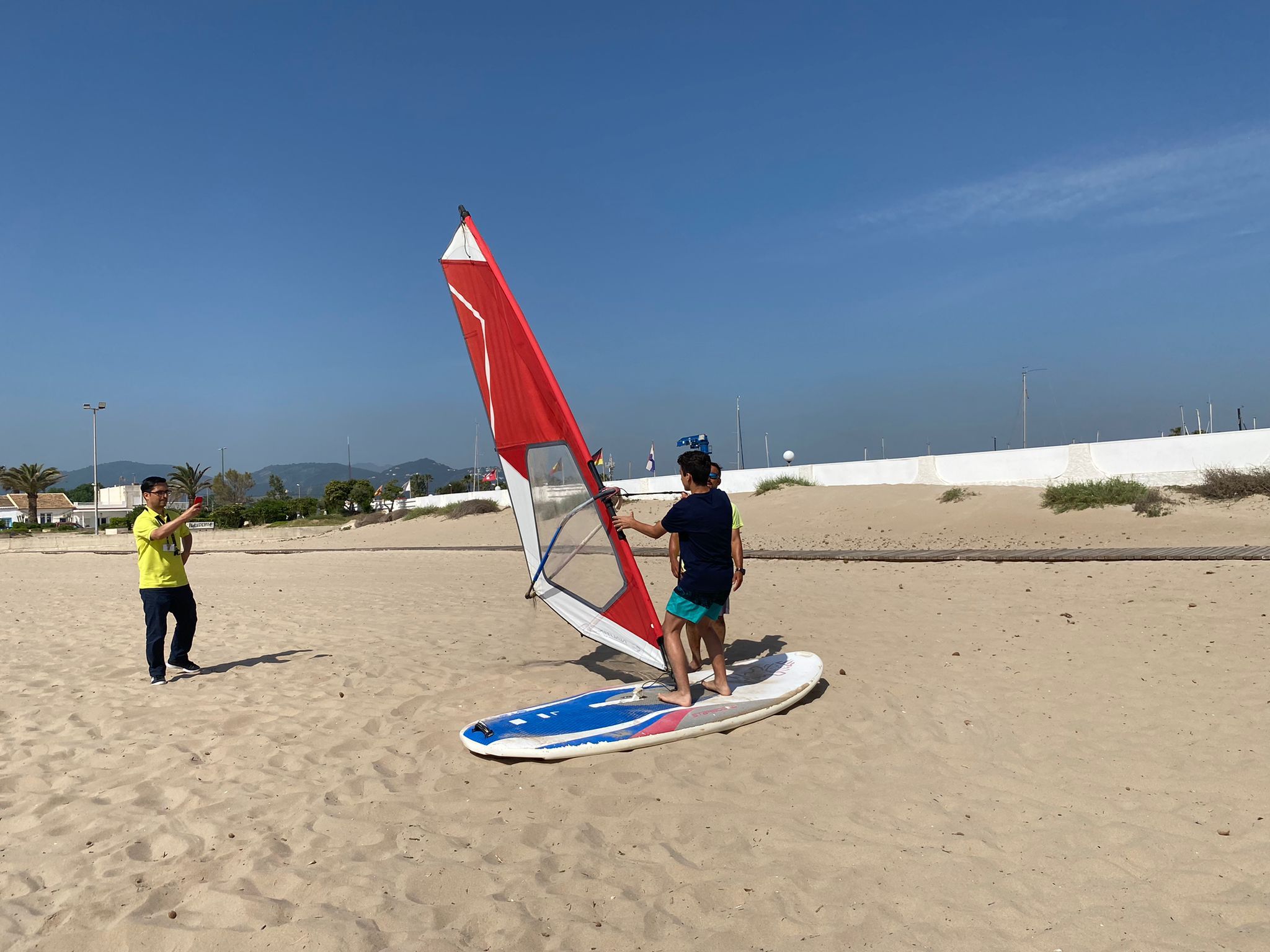El tema del jueves es "movement and forces" y los estudiantes comienzan sus actividades aprendiendo cómo las fuerzas afectan al movimiento de los objetos, y en especial aprenden sobre la física involucrada en el windsurf. Después de la explicación, tomamos algunas fotos de los alumnos en la tabla de windsurf para que se lleven a casa como recuerdo de su experiencia de inmersión.