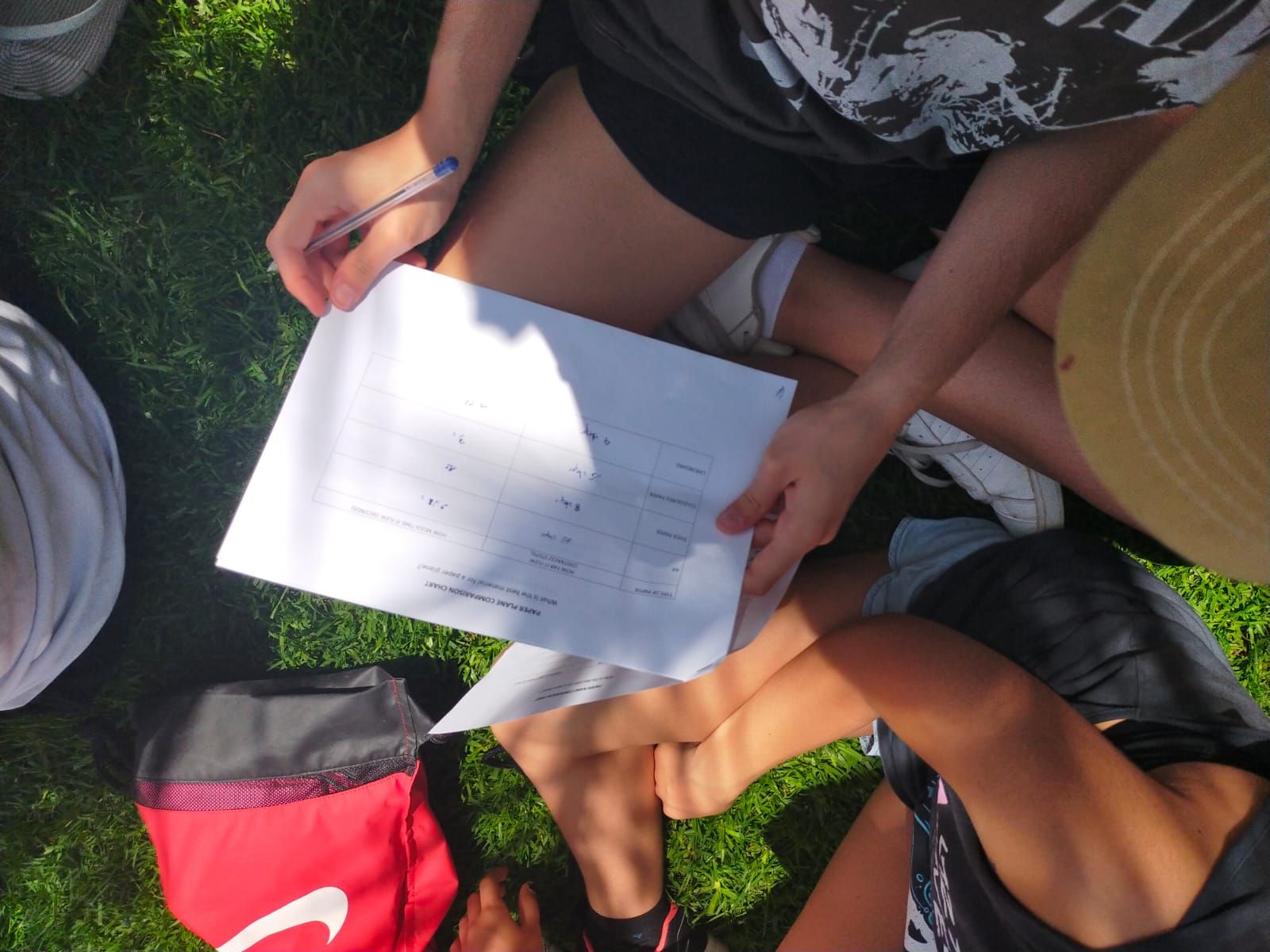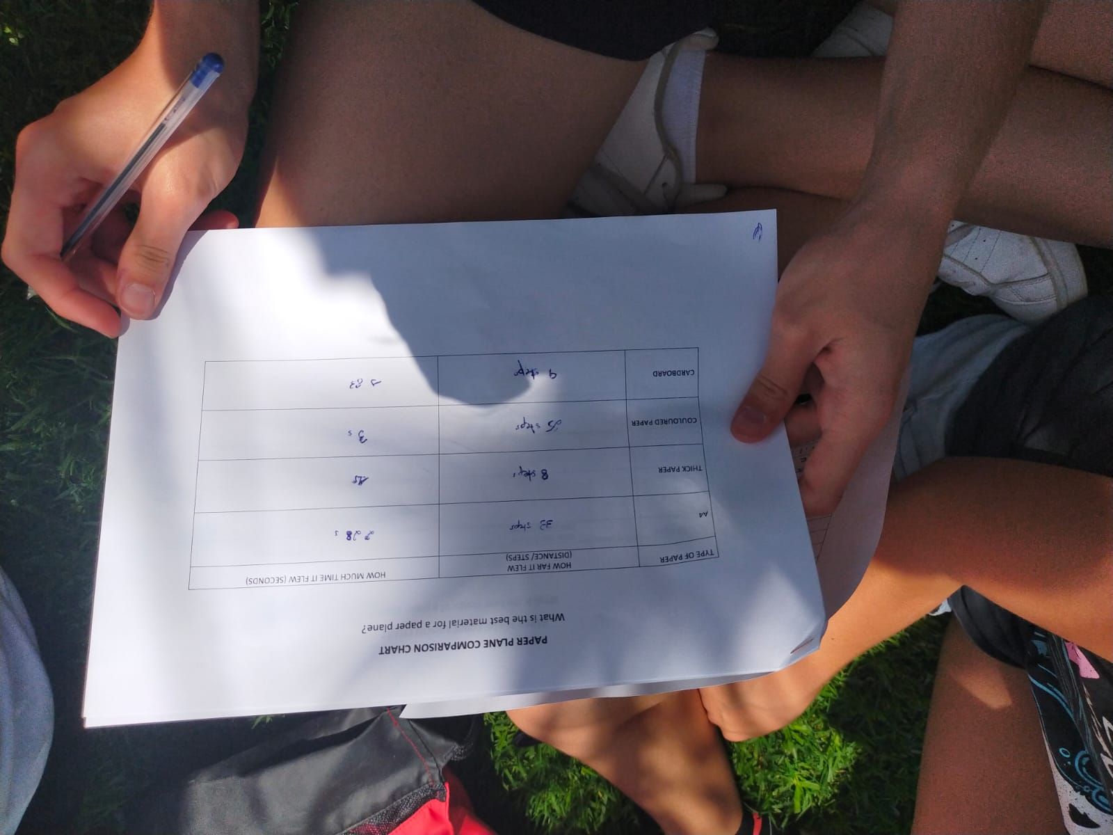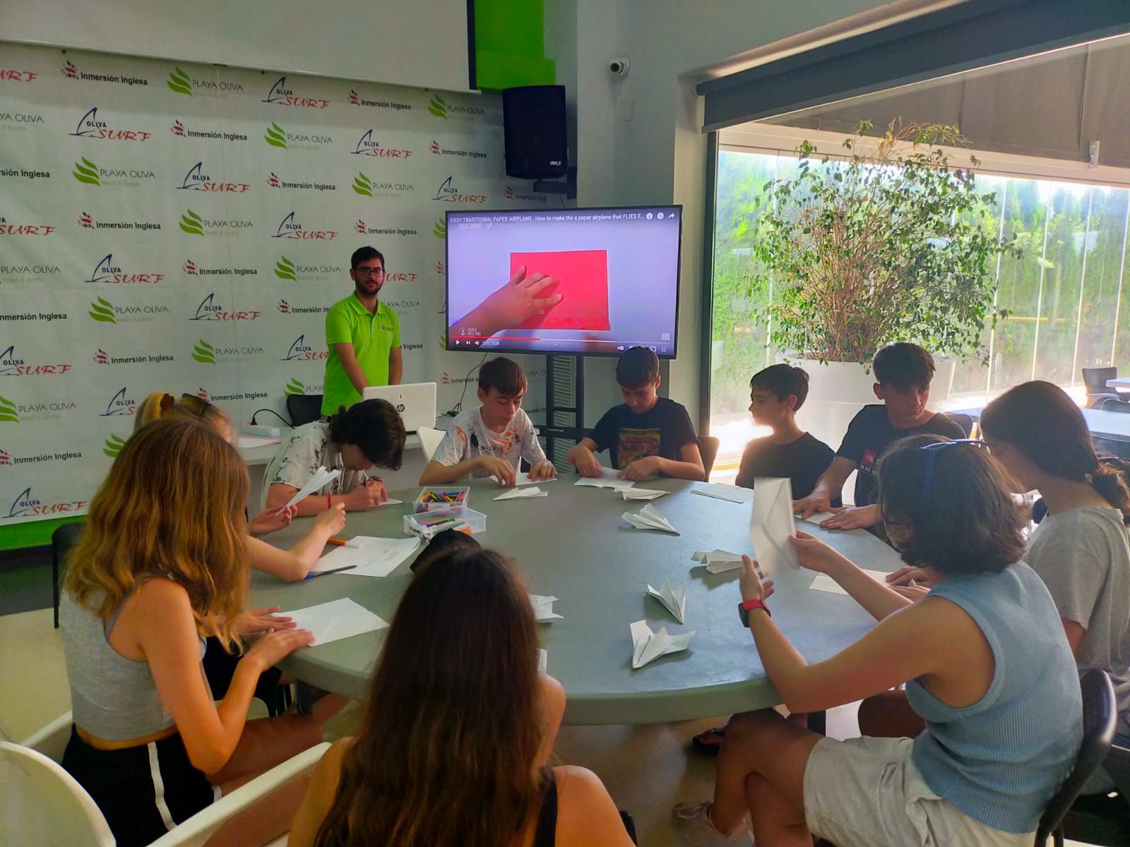 Para evitar las horas de mucha calor, volvemos al hotel y hacemos la actividad que teníamos programada por la tarde. Los estudiantes continuan aprendiendo sobre el tema "movement and forces" con aviones de papel. Aprenden que las fuerzas que permiten volar a un avión de papel son las mismas que permiten volar a los aviones de verdad. Cada grupo hace una investigación con sus aviones utilizando diferentes tipos de papel, diferentes tamaños de avión, estilos etc. para contestar una serie de preguntas. Finalmente los alumnos/as, basándose en los resultados de sus investigaciones, eligen su mejor avión y el mejor piloto para contestar a la pregunta que avión vuela mejor.