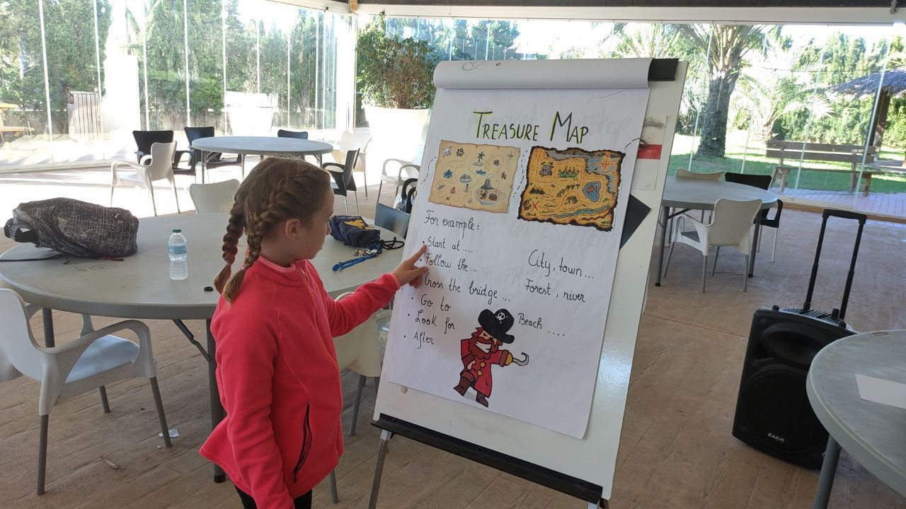 En el último día de actividades del programa de inmersión inglesa, los niños crean un mapa del tesoro con el que aprenden nuevas expresiones para dar indicaciones y en donde además, crean su propio mapa.