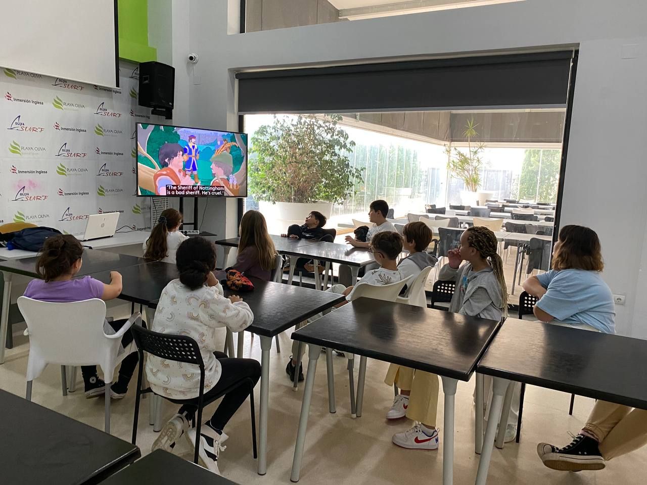 Después de la comida y del tiempo libre, los niños pueden seguir practicando su compresnsión del idioma inglés mientras se divierten, en la proyección de una película en inglés subtitulada. Este tiempo les permite recuperar fuerzas mientras llega la última actividad de la semana que vendrá después de la cena: " The Party".