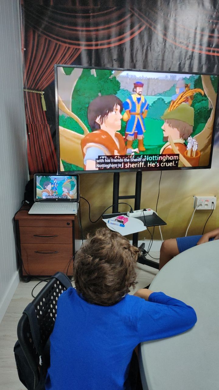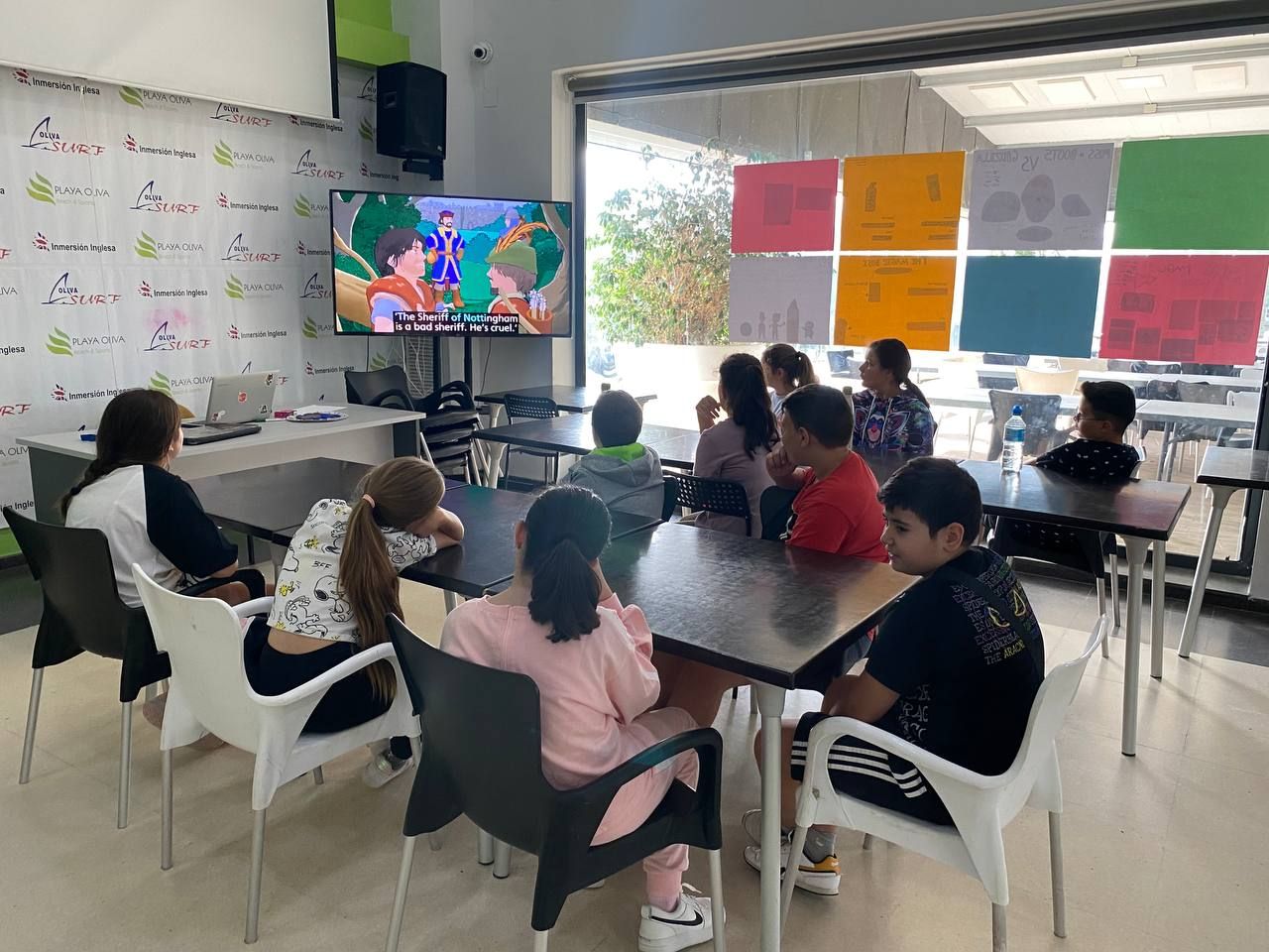 Para finalizar el día, después de la cena los niños vieron una película en inglés con subtítulos adecuada para ellos. Es un tiempo que, en donde además de divertirse con la proyección, también pueden practicar su comprensión oral del inglés.