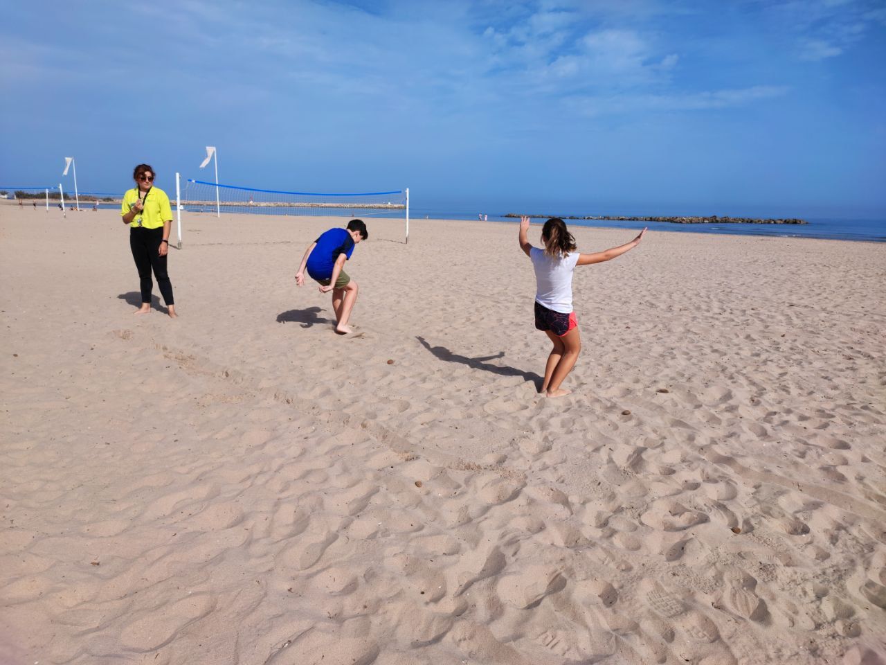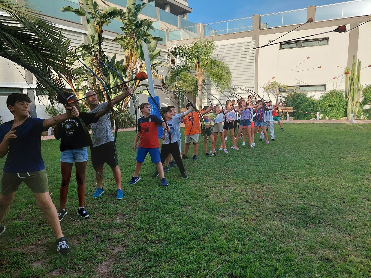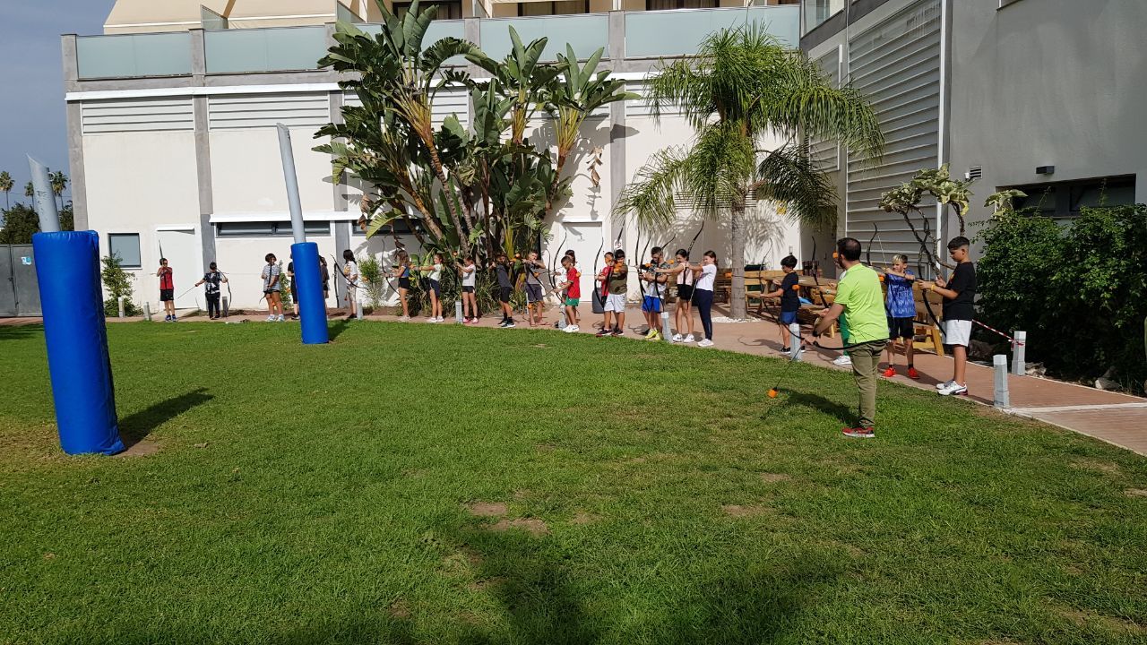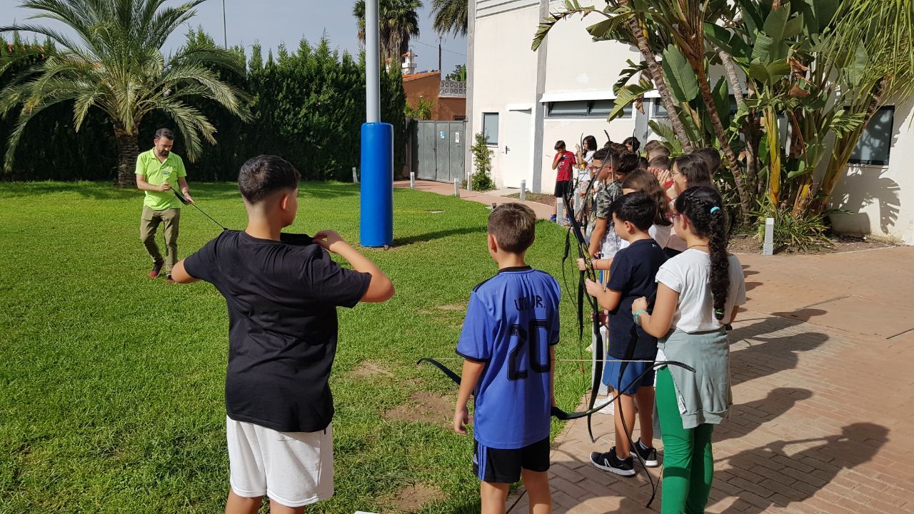 Esta actividad se realiza por turnos. Un grupo ha practicado el arco y la flecha y el otro ha podido disfrutar con actividades deportivas en la playa. Posteriormente, después de la comida y del trabajo propuesto por los profesores de los centros asistentes, los grupos realizan la actividad que no hayan realizado durante la mañana.