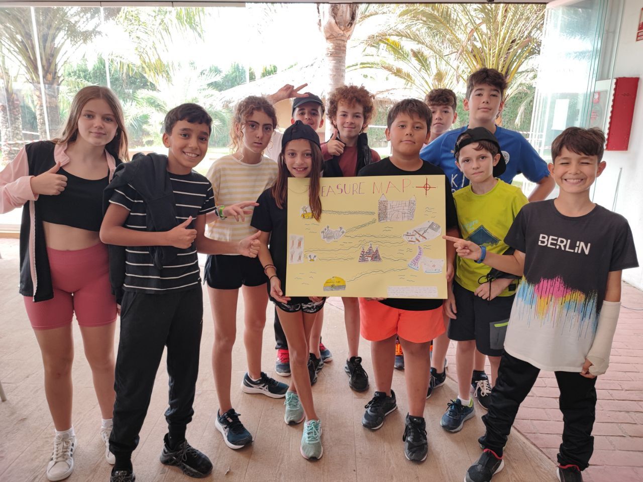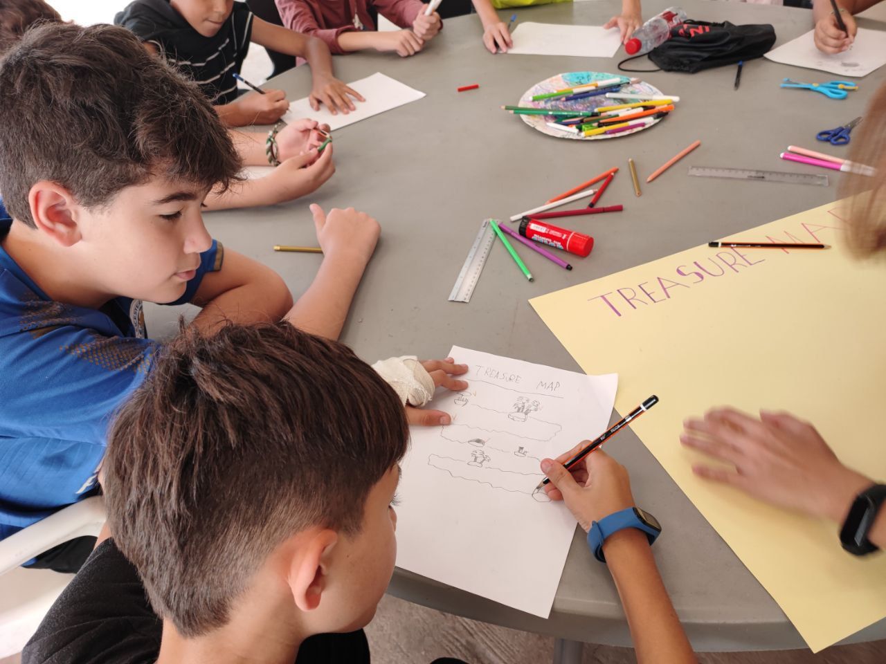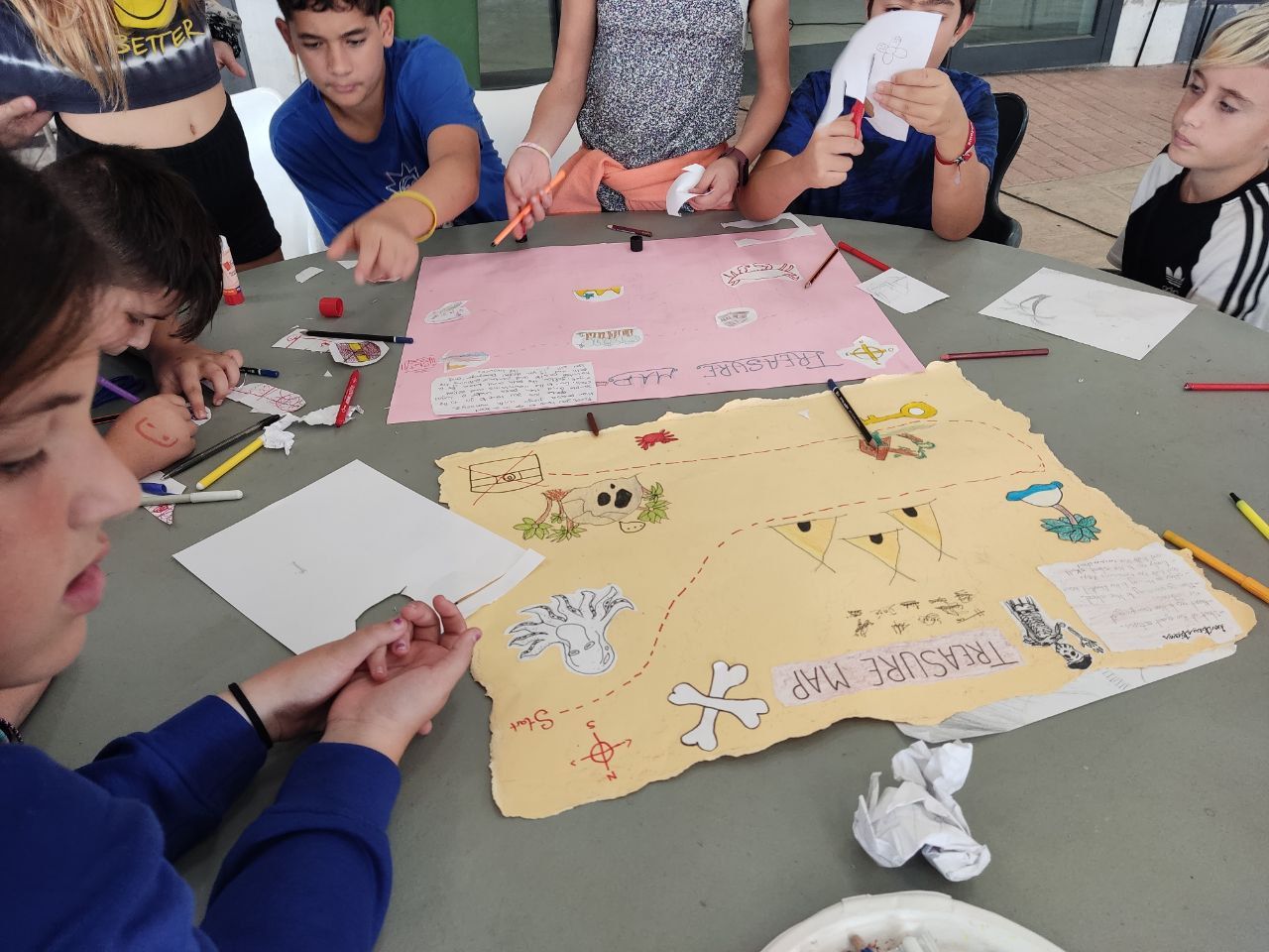 Después de esto, los niños vuelven a las instalaciones del hotel en donde realizan la actividad "Treasure Map". En este espacio los alumnos practican la descripción de lugares y como dar indicaciones en inglés, mientras usan todo su talento para crear un mapa del tesoro.
