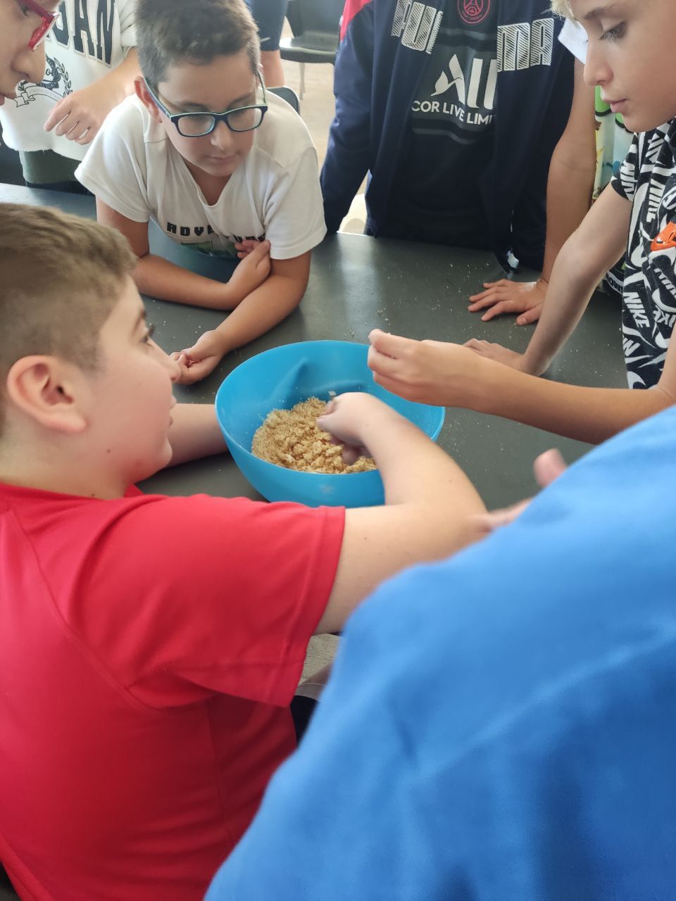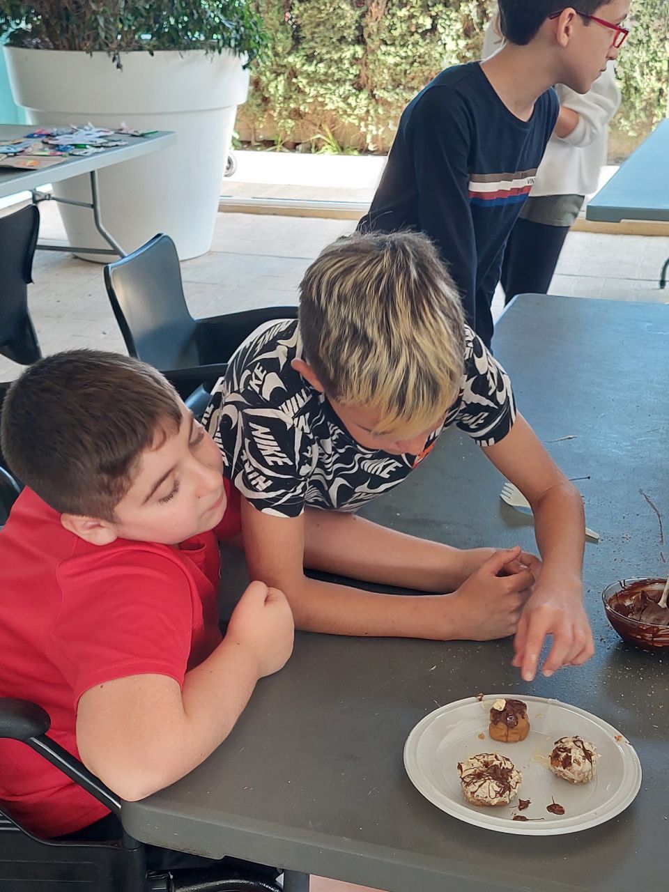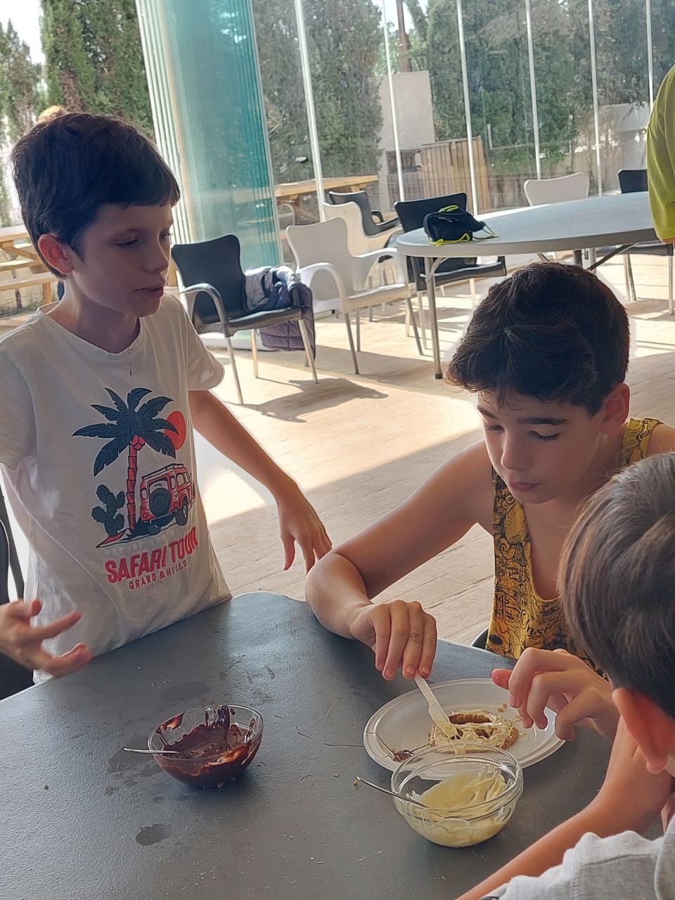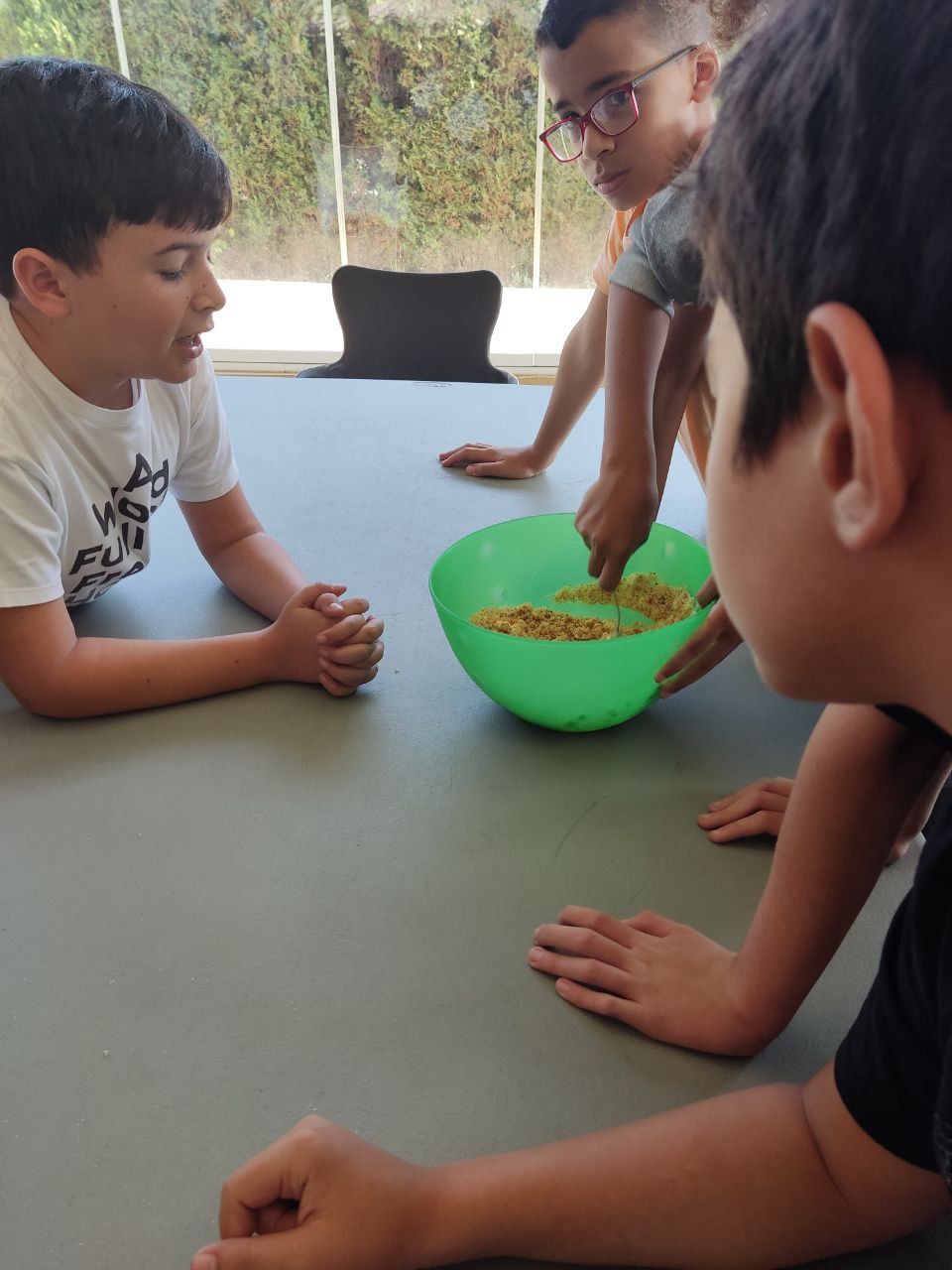 Después del "snack de la mañana, los niños han podido la oportunidad de demostrar sus capacidades culinarias en la actividad "cooking workshop". A partir de ingredientes básicos y siguiendo instrucciones en inglés, los alumnos por grupos, deben crear sus propios postres. Ha sido un tiempo muy entretenido.