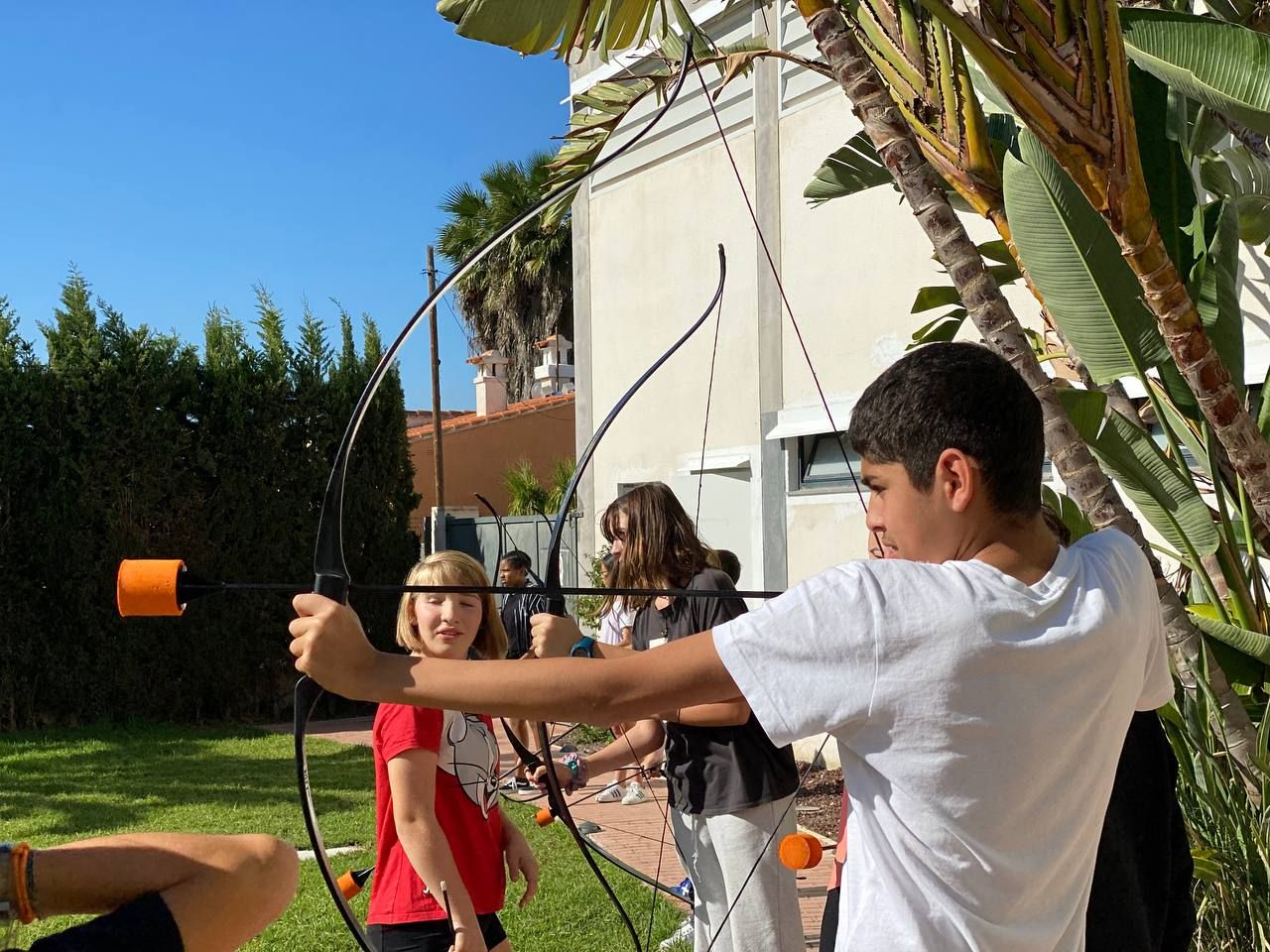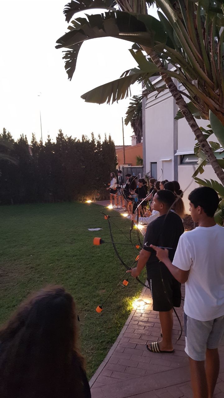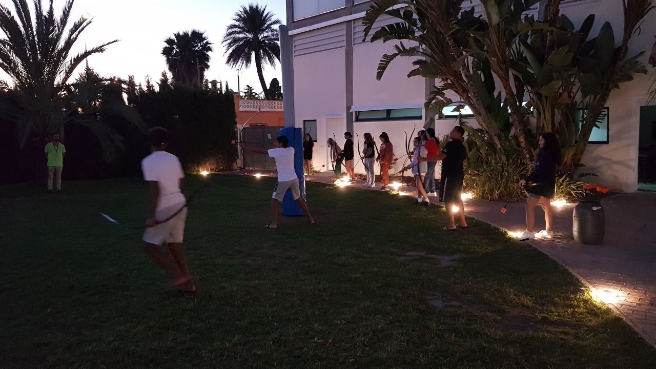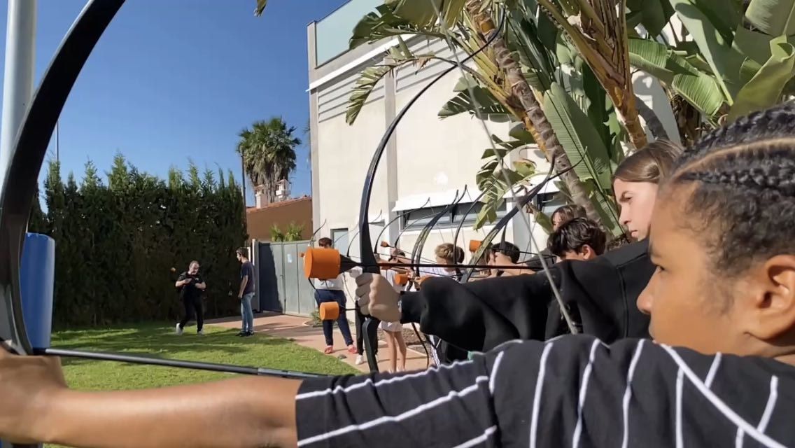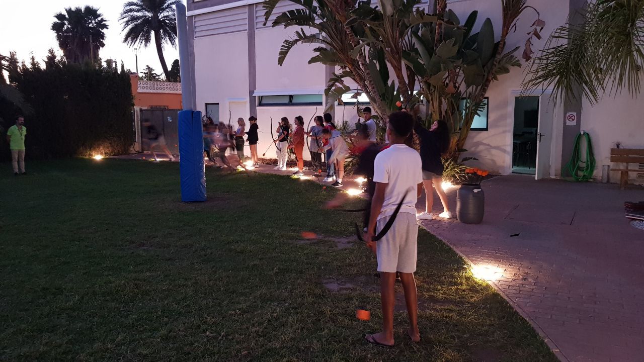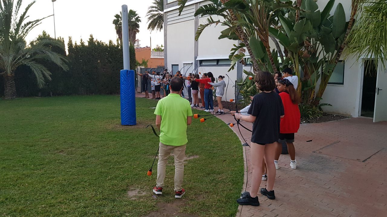 Esta actividad se realiza por turnos. Un grupo ha practicado el arco y la flecha y el otro ha podido disfrutar con actividades deportivas en la playa. Posteriormente, después de la comida y del trabajo propuesto por los profesores de los centros asistentes, los grupos realizan la actividad que no hayan realizado durante la mañana.