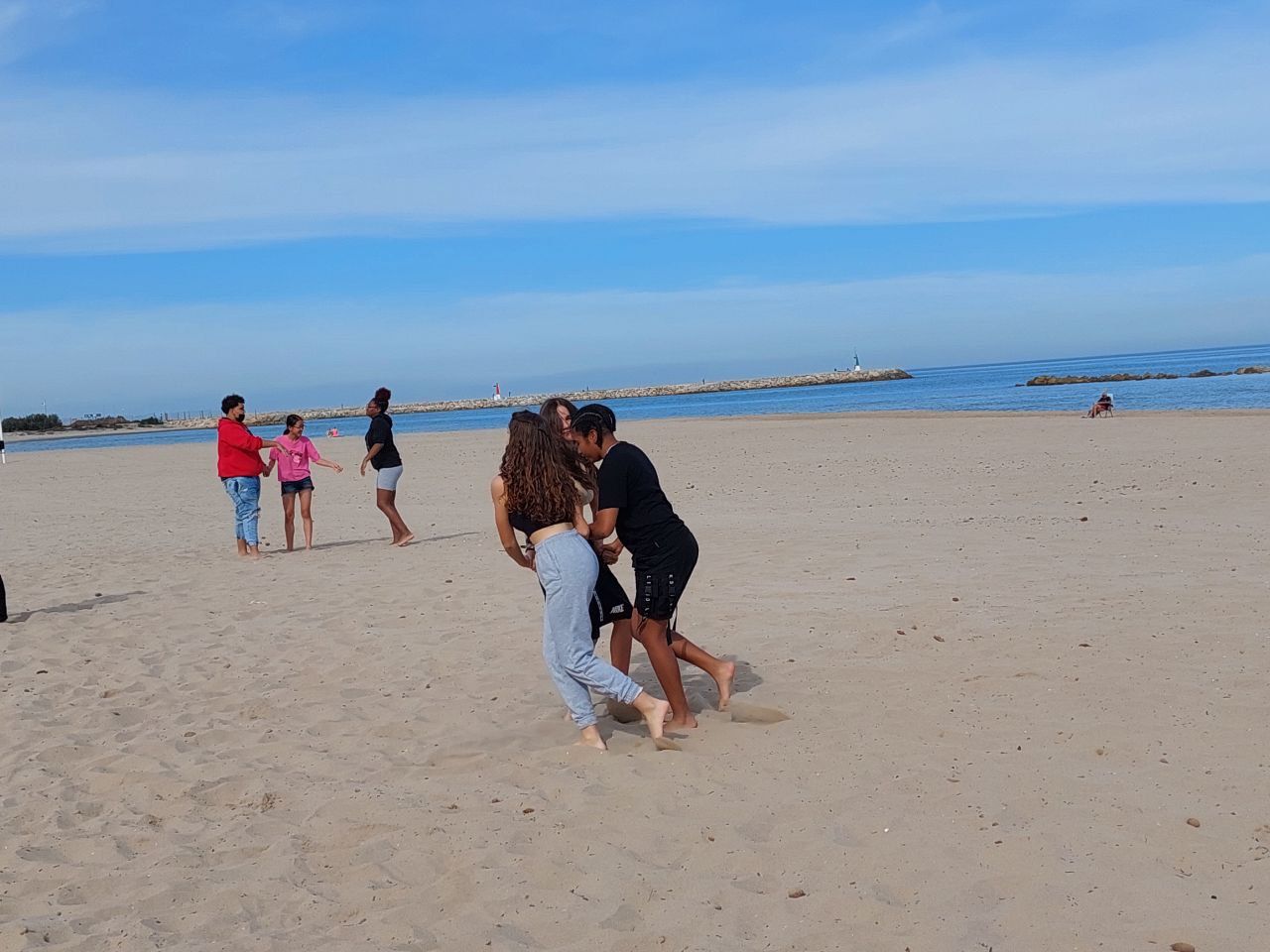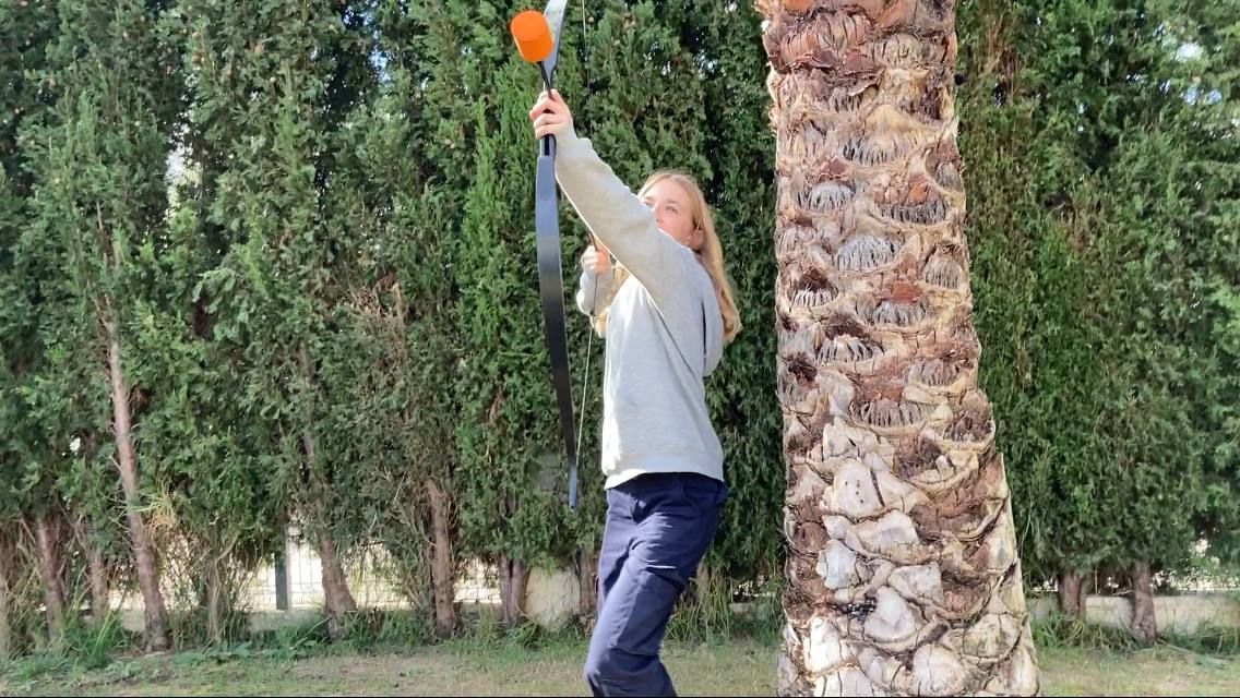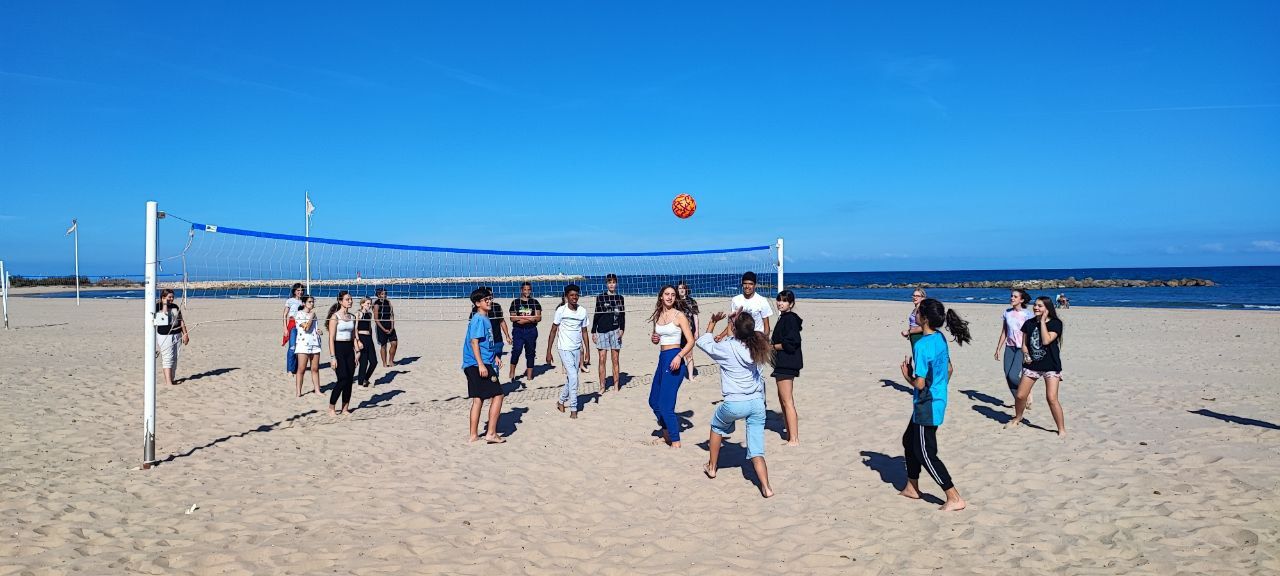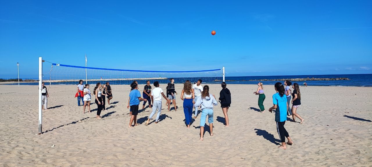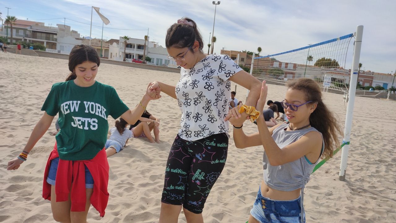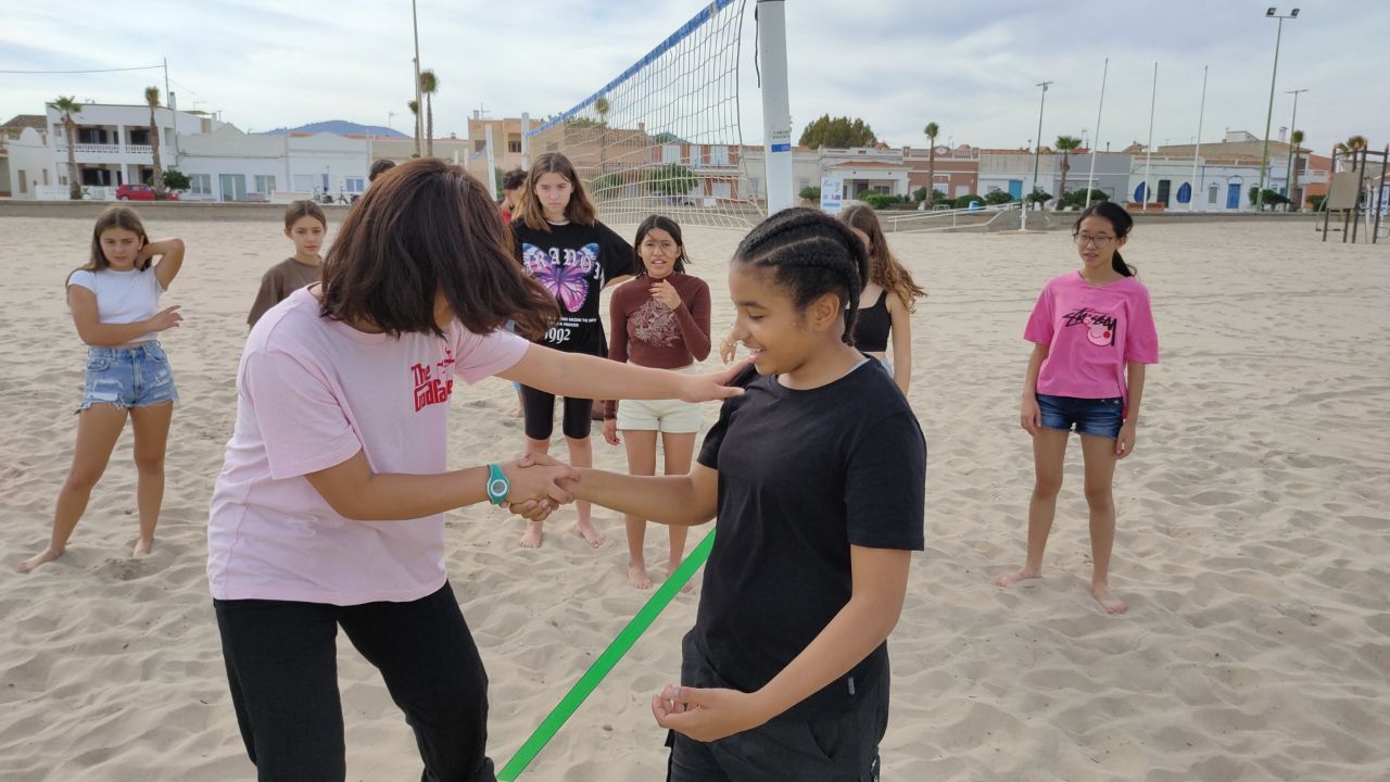 Esta actividad se realiza por turnos. Un grupo ha practicado el arco y la flecha y el otro ha podido disfrutar con actividades deportivas en la playa. Posteriormente, después de la comida y del trabajo propuesto por los profesores de los centros asistentes, los grupos realizan la actividad que no hayan realizado durante la mañana.