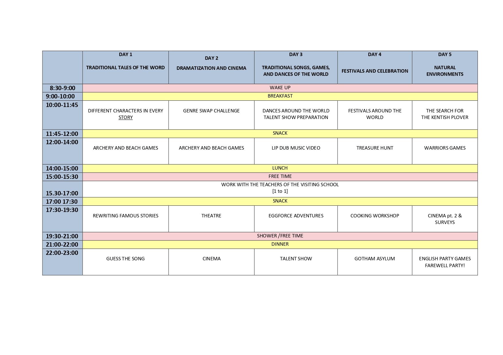 A continuación, presentamos el cronograma detallado de las actividades previstas para toda la semana, que establecerá la rutina diaria: