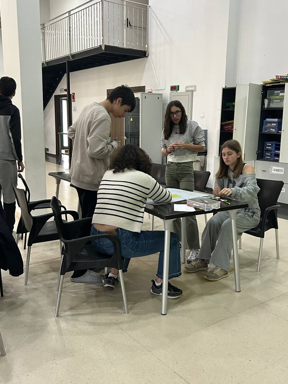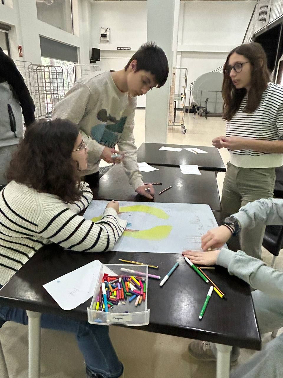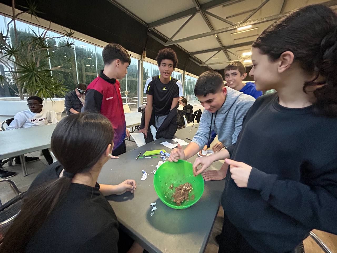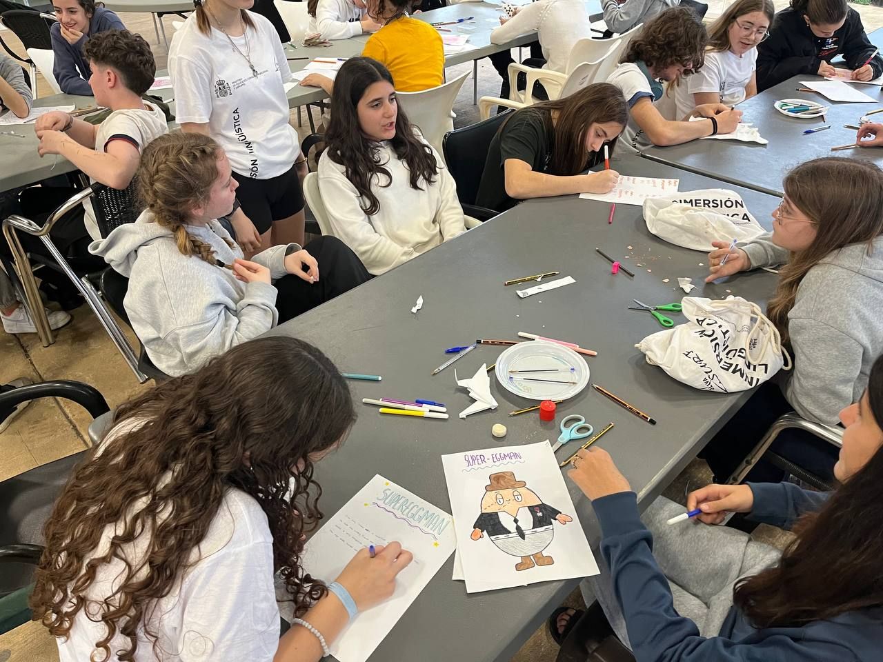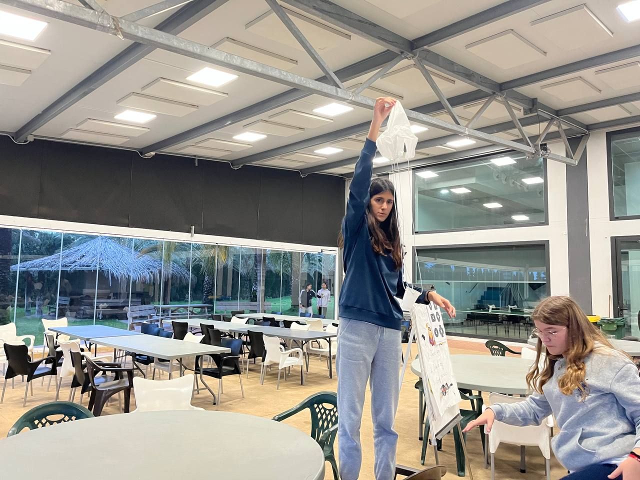 Posteriormente llevamos a cabo la actividad "Eggforce". En esta dinámica, los estudiantes debían crear un personaje, el "súper huevo", y contar su historia. Posteriormente, cada grupo diseñó un paracaídas para proteger a su personaje. La creatividad y el trabajo en equipo son fundamentales para que el huevo pueda sobrevivir al lanzamiento del mismo desde el tejado.