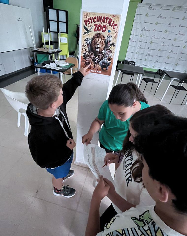 Tras la cena, los estudiantes participaron en la actividad "Psychiatric Zoo". En esta dinámica, cada profesor del programa de inmersión representaba a un animal del zoológico psiquiátrico y se encontraba en diferentes áreas del hotel. Los alumnos debían localizar a los profesores y, a través de una conversación en inglés, averiguar qué animal interpretaban, su nombre, edad y su trastorno mental. Esta actividad fue toda una aventura para los estudiantes, ofreciéndoles una excelente oportunidad para mejorar su habilidad de comunicación oral en inglés.